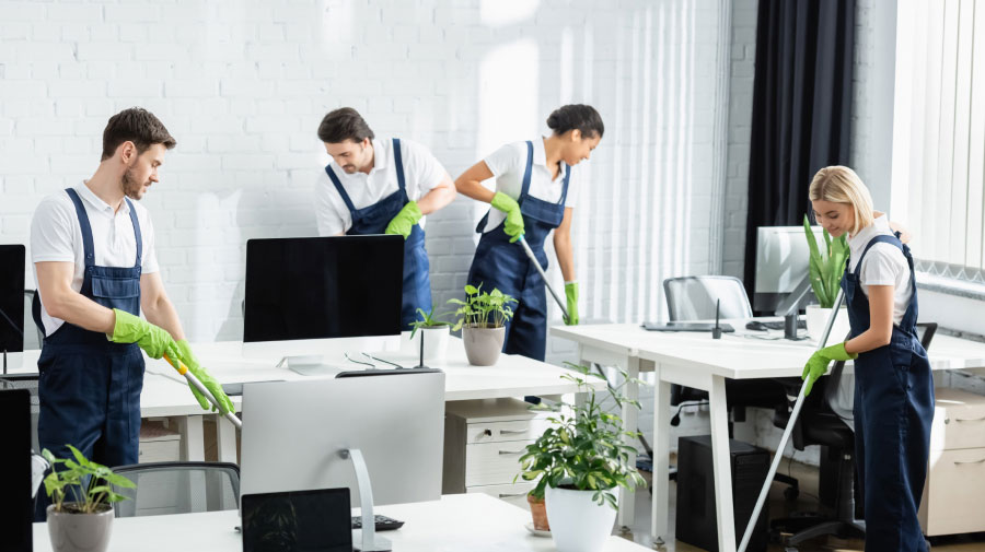 Количество сотрудников зависит от площади помещения, ежедневную уборку офиса площадью до 500 квадратных метров выполняет один/два сотрудника.